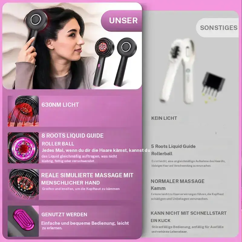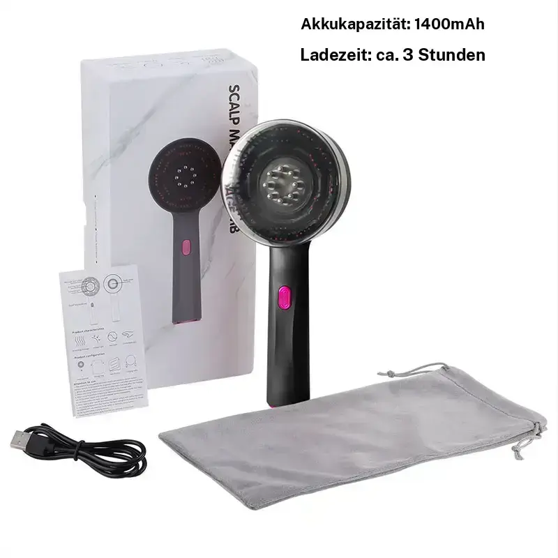[Ergonomischer Griff]:Mit ergonomischem Griffür ein leichtes Handling,ermoglicht es einen komfortablen Massage,der alle Bereiche des Kopfhauts erreicht.